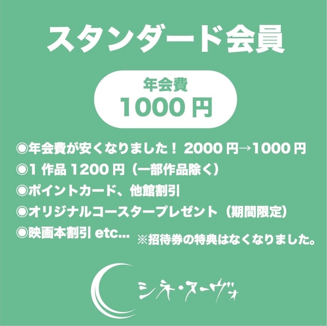 -     シネクラブ【スタンダード会員】 ¥1,000 【こちらよりシネ・ヌーヴォの会員制度<シネクラブ会員>への新規ご入会・更新が可能です。】 ※ご注文確定の際、配送方法を必ずご確認ください! 2025年8月1日よりシネ・ヌーヴォ・シネクラブ会員制度を改訂・追加いたします。より加入しやすくなった【スタンダード会員】に加えて当館への継続的なご支援・サポートとなります【サポート会員】【企業・団体サポート会員】の3種類となります。多様で豊かな映画の上映を支えていただきたく、ぜひご加入くださいますよう、どうぞよろしくお願いいたします。 【スタンダード会員】 〈年会費〉 1000円(税込)有効期限:入会日より1年間 入会日:受付にてお受け取りの方→ご来館日/郵送にてお受け取りの方→発送日 〈特典〉 1.1作品1200円/同伴者1名様まで有効(一部作品、特別興行は除く) 2.ポイントカード/ポイント10個で招待券(有効期限3ヶ月)/毎週火曜日ダブルポイントデー 3.映画本、DVD、CDなどの割引 4.姉妹館割引/シネ・ピピアにて1200円でご鑑賞いただけます(一部作品除く) 5.他館割引あり/プラネット+1、第七藝術劇場、シアターセブン、京都シネマ、出町座、神戸映画資料館 6.メールアドレスご記入の方には、毎月発行のスケジュールデータをお送りします ※招待券の特典はなくなりました。 ※オリジナルコースター配布終了しました。 詳細はこちらをご覧ください。 http://www.cinenouveau.com/cineclub/cineclub.html ポイントカードのお受け取り方法を《シネ・ヌーヴォ受取》/《郵送受取》どちらかお選びいただけます(郵送の場合送料がかかります)。 ★シネ・ヌーヴォ受取をご希望の方…次回ご来館の際に、ポイントカードをお渡しいたしますので、受付にてお客様のお名前をお伝えください。 ★更新をご希望の方は、次回ご来館の際、受付まで期限切れのカードをお持ちください。 ポイント引き継ぎ+更新特典として1ポイントプレゼントいたします。